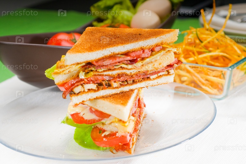 Свежий вкусный классический клубный сэндвич на прозрачном стеклянном блюде