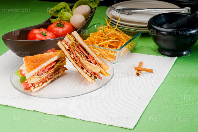 Свежий вкусный классический клубный сэндвич на прозрачном стеклянном блюде
