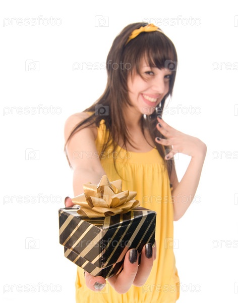 Красивая девушка с подарком на белом фоне