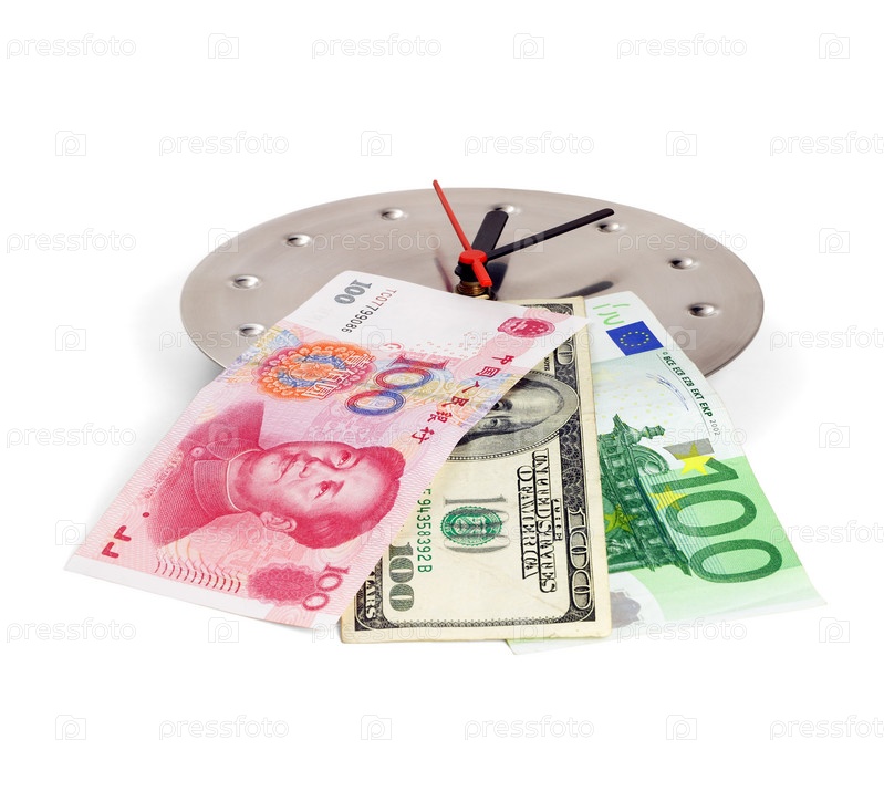 Денежные банкноты на часах из нержавеющей стали на белом фоне