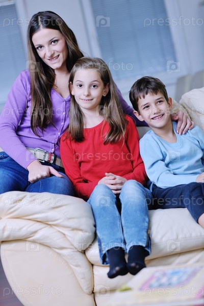 Счастливая молодая мать и дети развлекаются и играют в современной домашней гостиной