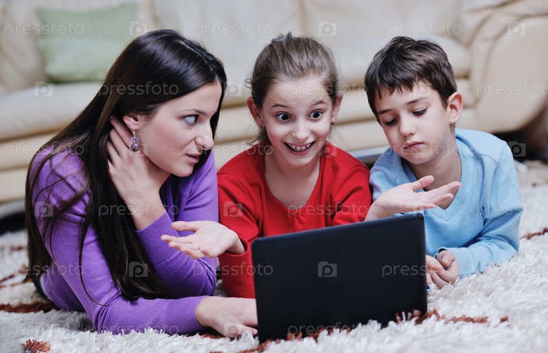Счастливая молодая мать и дети развлекаются и играют в современной домашней гостиной