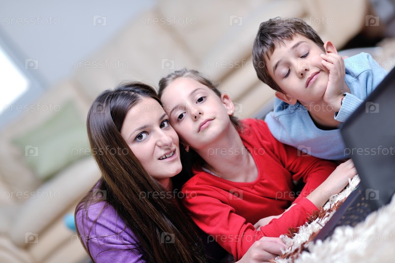 Счастливая молодая мать и дети развлекаются и играют в современной домашней гостиной