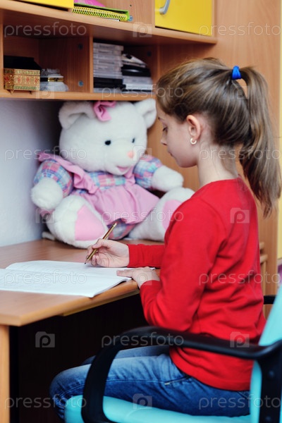 Счастливая школьница делает домашнее задание дома