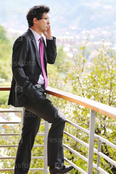 Молодой успешный бизнесмен говорит по сотовому телефону на балконе