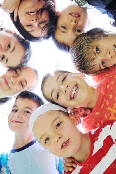 Счастливые дети стоят кругом, соприкасаясь головами