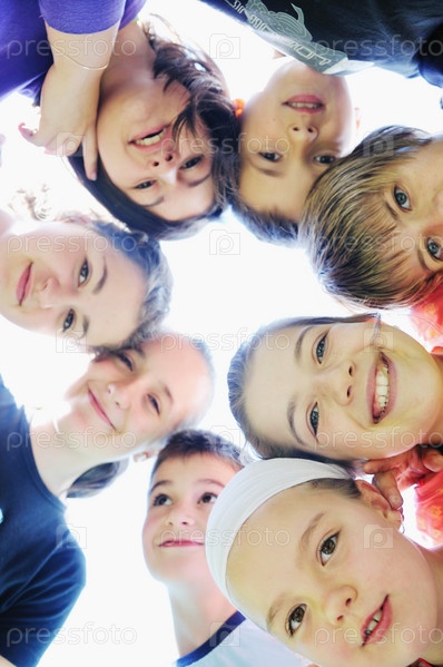 Счастливые дети стоят кругом, соприкасаясь головами