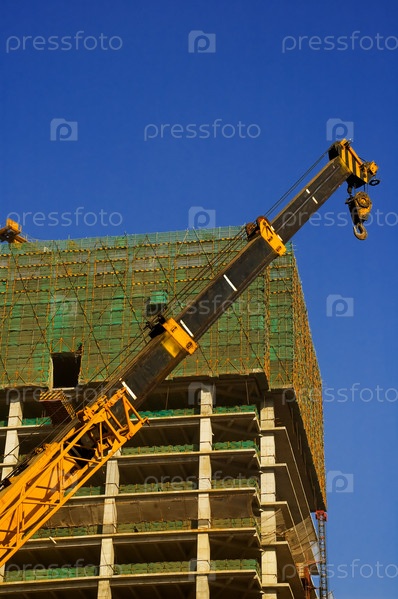 Строительный кран на фоне строящегося офисного небоскреба