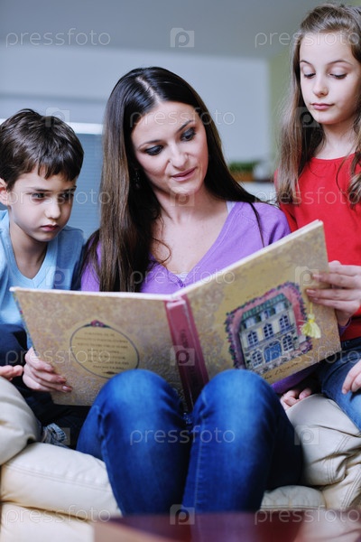 Мать с детьми читают книгу в современной гостиной