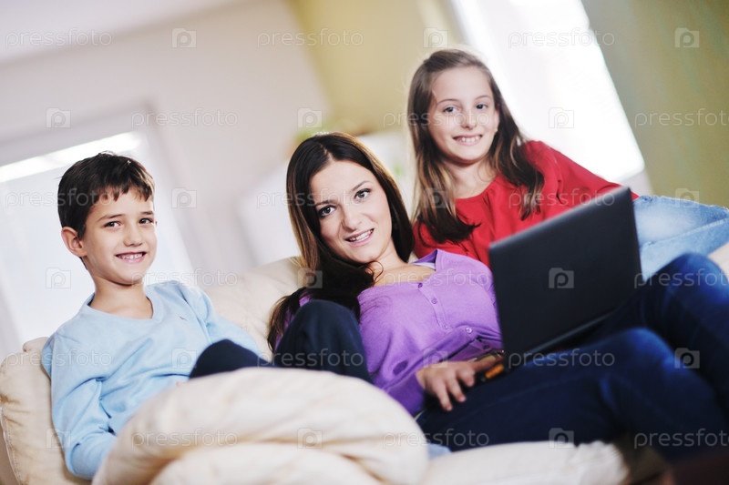 Счастливая семья из мамы и детей играет в современной гостиной