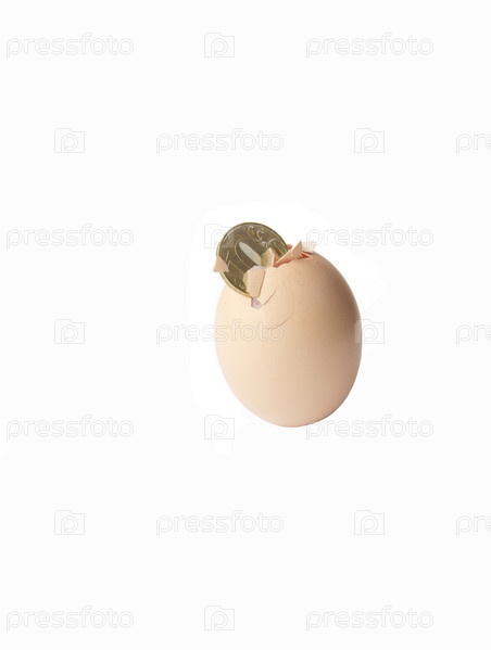 Куриное яйцо с монетой на белом фоне