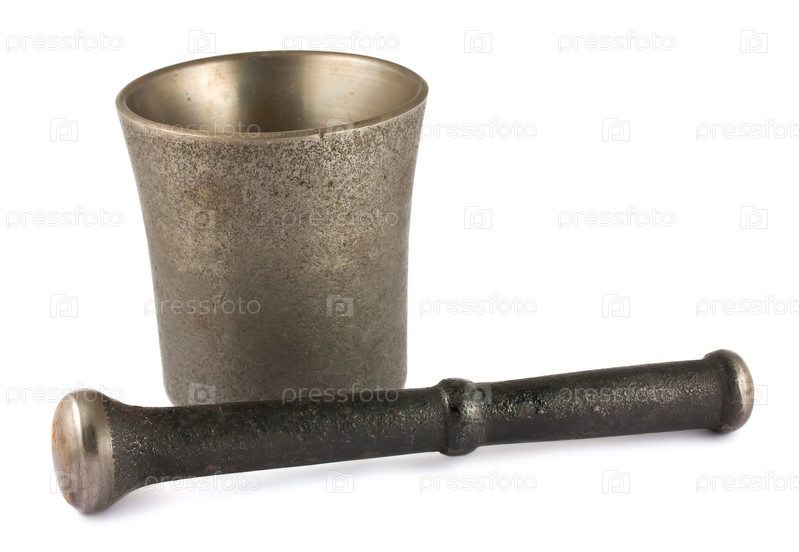 Винтажная железная ступка с пестиком, изолированы на белом фоне
