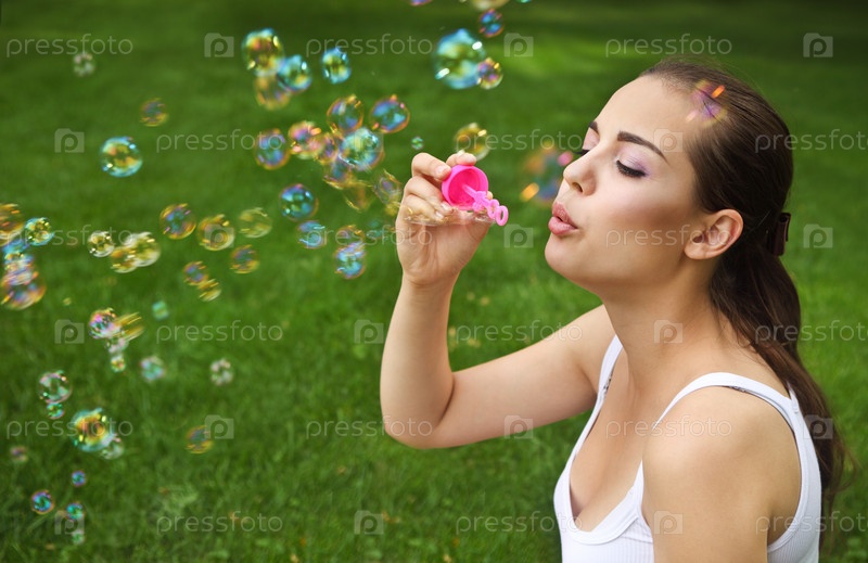 Красивая девушка пускает мыльные пузыри на улице