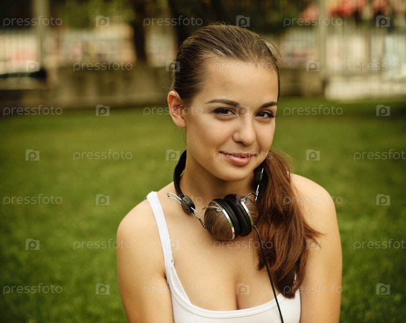 Красивая девушка с наушниками сидит на траве в летнем парке