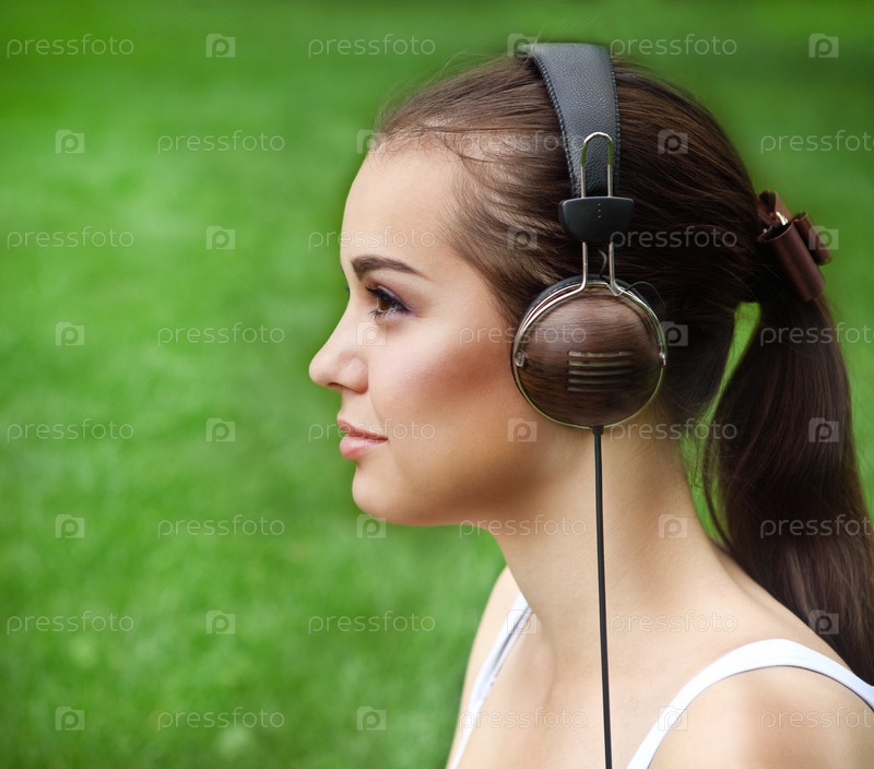 Красивая девушка с наушниками на фоне травы в летнем парке