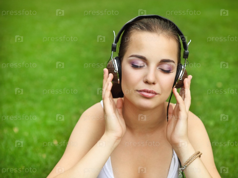 Красивая девушка с наушниками на фоне травы в летнем парке