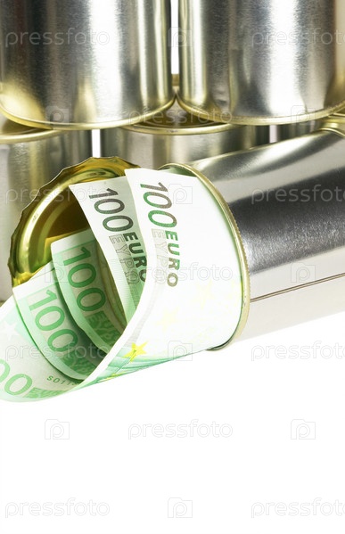 Евро в жестяной банке на белом фоне