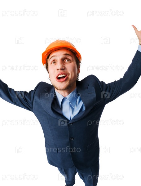 Молодой бизнесмен в строительной каске, изолированный на белом фоне