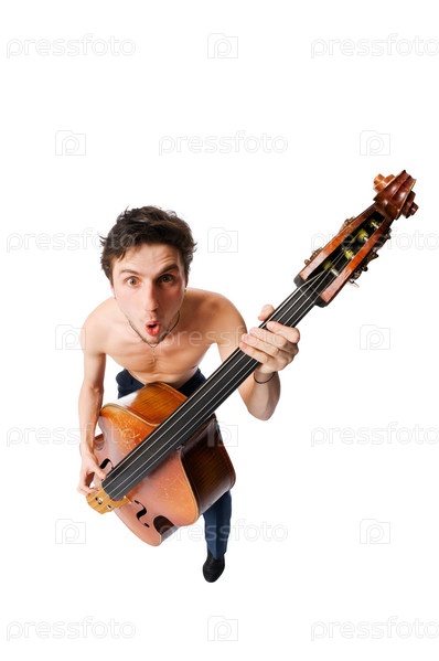 Музыкант, играющий на контрабасе, изолированный на белом фоне