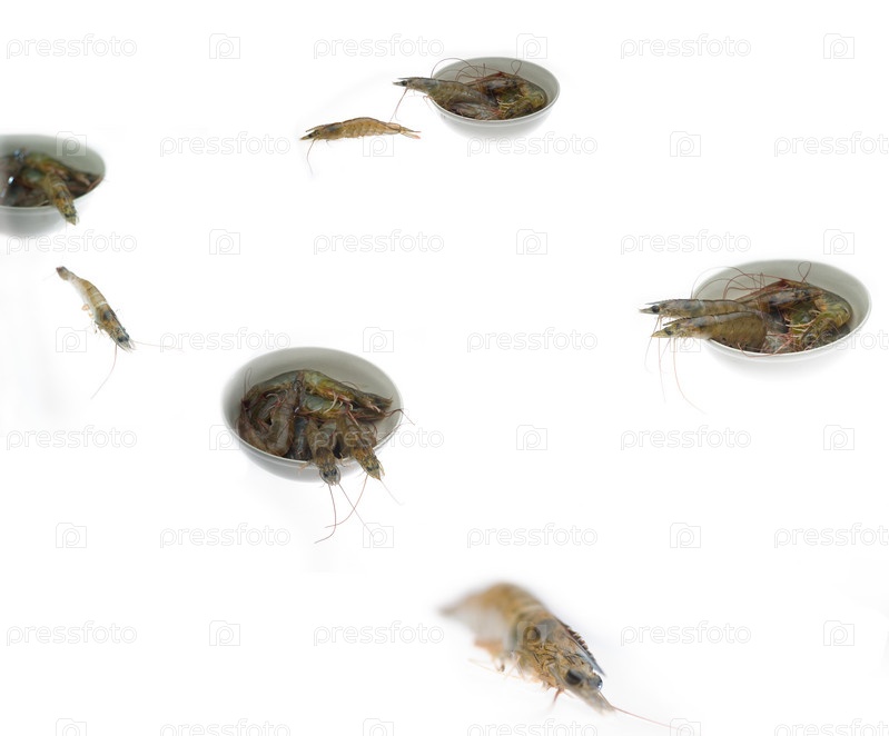 Живые креветки расползаются из чашек на белом фоне