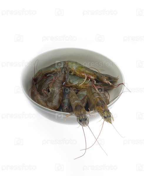 Живые креветки в чашке на белом фоне