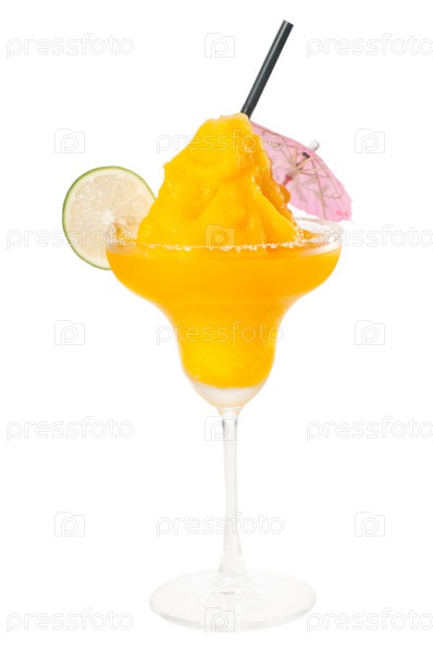 Манго Маргарита дайкири с лаймом, черной соломинкой и розовым зонтиком, изолировано на белом фоне