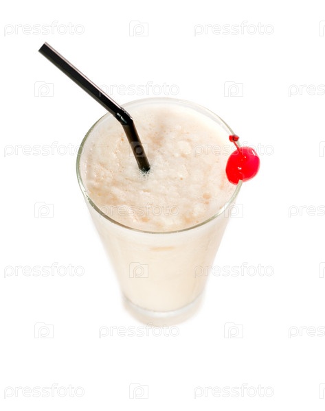 Банановый дайкири с красной вишней и черной соломинкой, изолировано на белом фоне