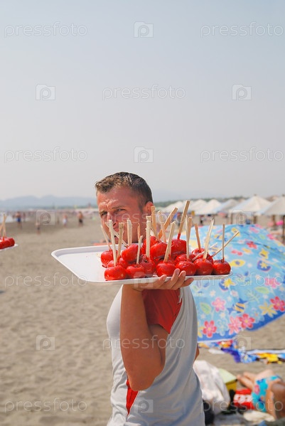 Портрет мужчины с подносом в руках на пляже