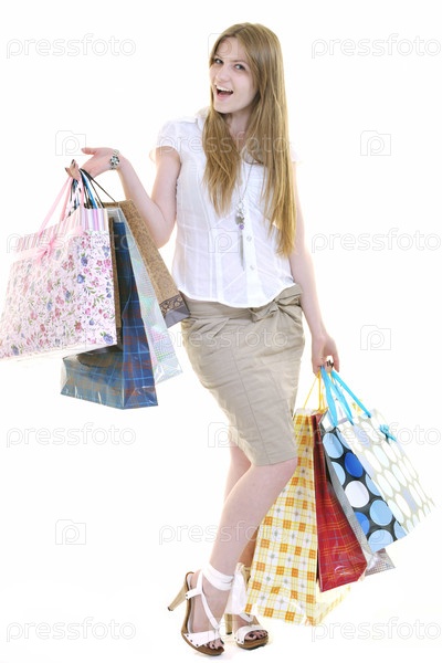 Молодая женщина с покупками, изолирована на белом фоне
