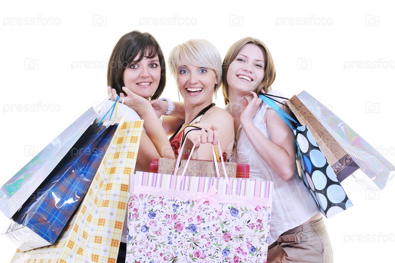 Счастливые молодые женщины с покупками, изолированы на белом фоне