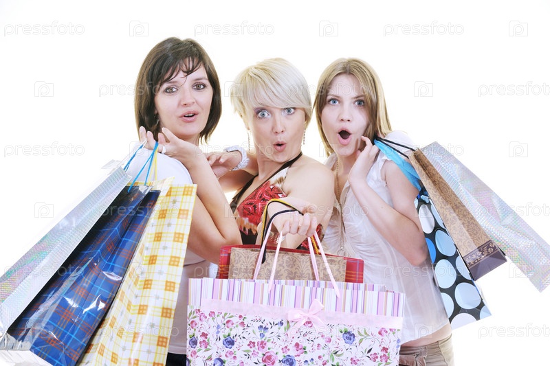 Счастливые молодые женщины с покупками, изолированы на белом фоне