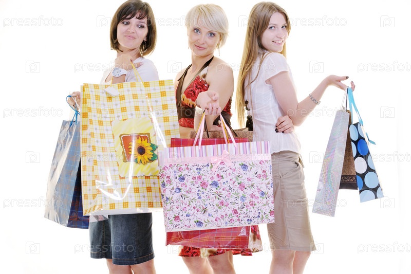 Счастливые молодые женщины с покупками, изолированы на белом фоне