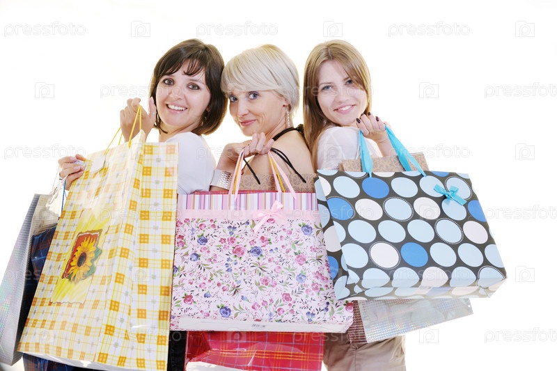 Счастливые молодые женщины с покупками, изолированы на белом фоне