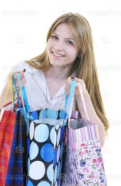 Девушка с разноцветными пакетами с покупками на белом фоне