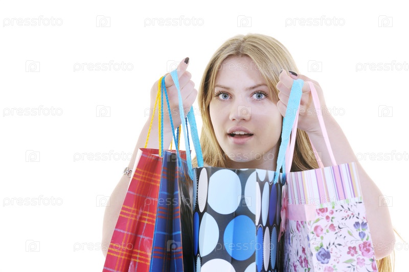 Девушка с разноцветными пакетами с покупками на белом фоне