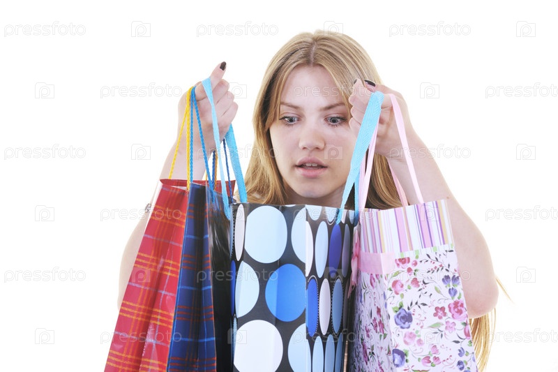 Счастливая девушка с разноцветными пакетами с покупками на белом фоне