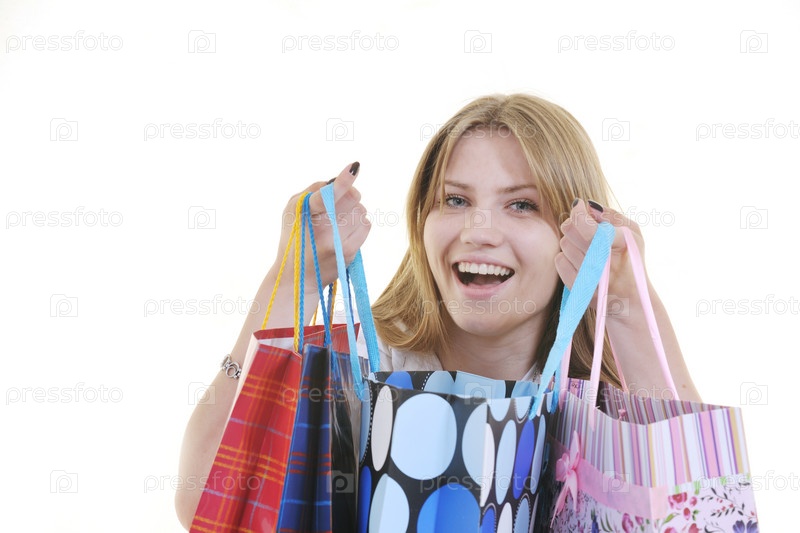 Счастливая девушка с разноцветными пакетами с покупками на белом фоне