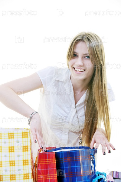 Девушка с разноцветными пакетами с покупками на белом фоне