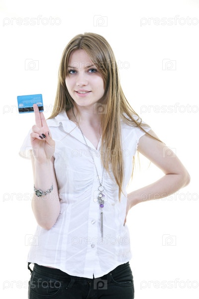 Женщина держит кредитную карту, изолирована на белом фоне