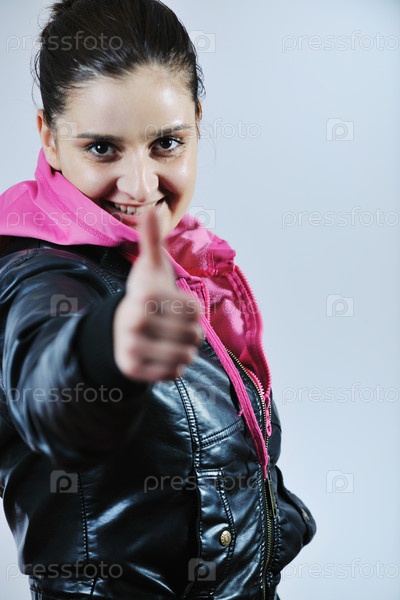 Молодая брюнетка показывает большой палец вверх