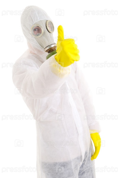 Человек в защитном костюме и противогазе показывает жестом, что все хорошо