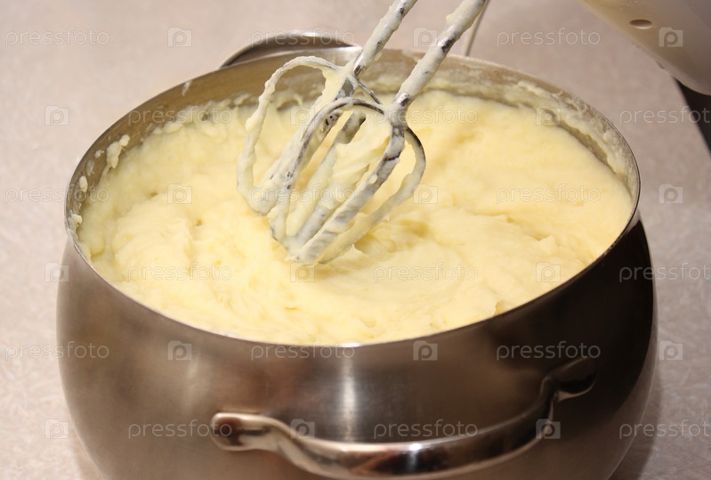 Картофельное пюре в кастрюле перемешивается венчиком, крупным планом
