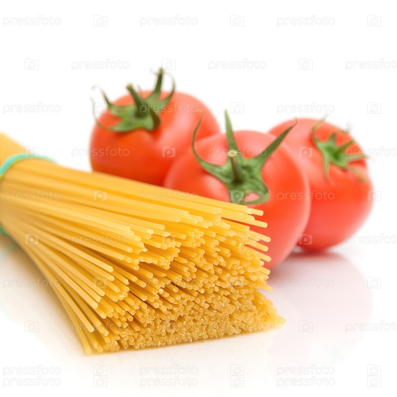 Спагетти и помидоры на белом фоне крупным планом