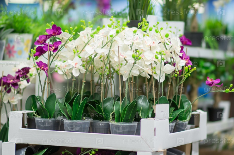 Красивые цветы на полках в магазине