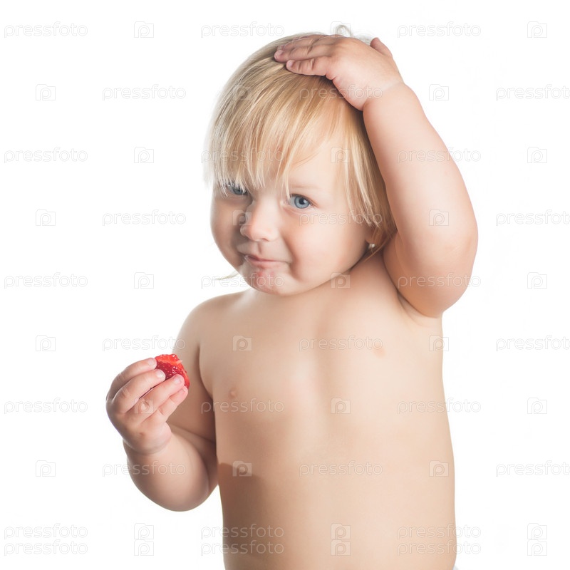 Девочка ест клубнику, на белом фоне