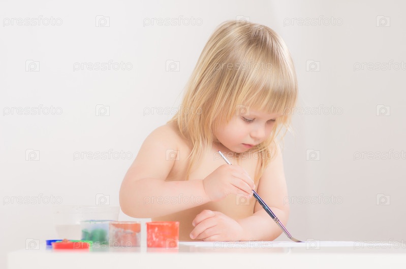 Очаровательная малышка рисует красками на бумаге