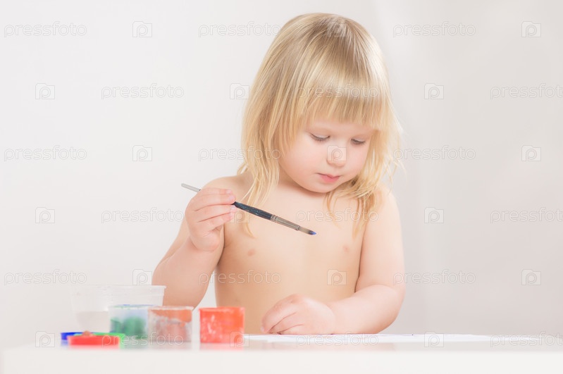 Очаровательная малышка рисует красками на бумаге