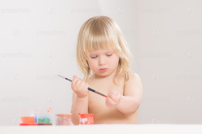 Очаровательная малышка рисует красками на бумаге