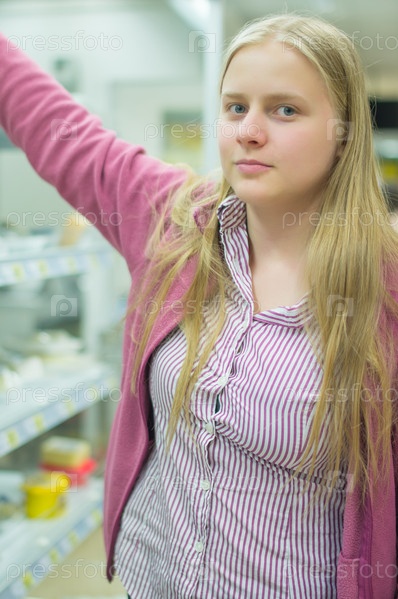Молодая женщина возле полки с в супермаркете