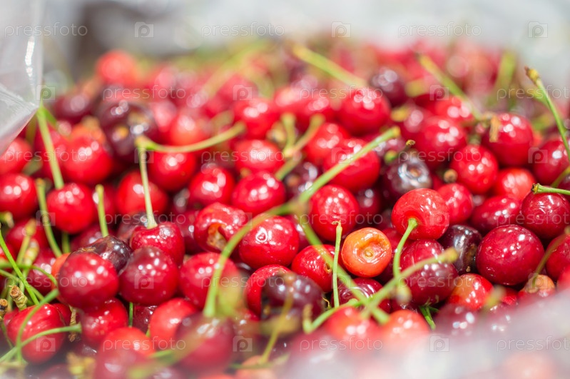 Красные вишни в коробках в супермаркете